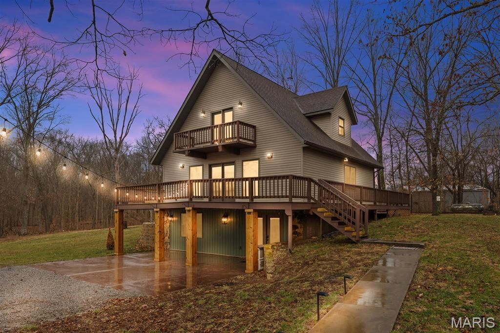 Nestled among the trees on six acres, this home offers over 2,000 sq ft of finished living space, and the perfect balance of privacy and convenience. A curved driveway guides you in, where the A-frame home and oversized garage come into view against the backdrop of mature trees, offering an impressive introduction to the property.Less than 15 minutes from Mount Vernon and only minutes from everyday amenities.From the expansive front deck, you step into the living room, where abundant natural light, updated carpet, and a newly installed gas fireplace and surround create a welcoming focal point. The kitchen showcases new flooring and updated appliances (2024) and provides direct access to the large back deck, ideal for entertaining or enjoying quiet mornings overlooking the woods.The main level offers one bedroom and a full bath, while upstairs you'll find two additional bedrooms and another full bath. One upper bedroom features private access to a balcony overlooking the property, and the third, currently used as a craft room, includes a spacious closet and built-in closet system.The finished walkout lower level expands your living space with updated flooring, a wet bar, and a newly added beverage cooler (2024). Double doors lead to a covered concrete area beneath the deck, framed by cedar-wrapped posts and offering shaded outdoor space.Outside, thoughtful improvements enhance both beauty and function. Updated landscaping, a new retaining wall, and recently cleared underbrush open up the wooded acreage while maintaining its natural beauty. A termite bait system installed in 2024 and serviced quarterly provides added peace of mind. Wood and stone walkways wind through the open lawn, and Edison lights are strung overhead across the spacious yard, creating an evening backdrop that serves as the finishing touch to the outdoor space.The oversized, climate-controlled two car garage (built in 2018) offers plenty of room for vehicles, storage and workspace. Situated on the back of the property, a large outbuilding with concrete flooring, electric, and water adds even more versatility and is complete with an attached chicken coop, ideal for those seeking a touch of homestead living.The home was just professionally cleaned and is move-in ready!