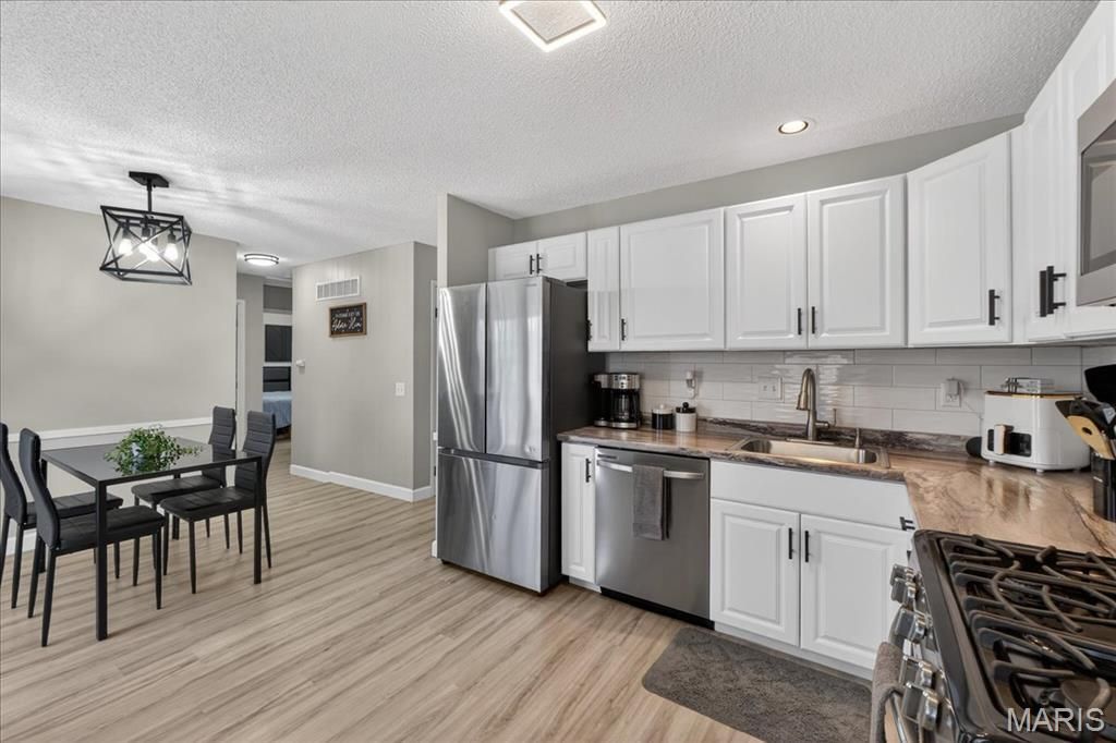 Beautifully renovated 3-bedroom, 1-bath ranch packed with upgrades inside and out! The exterior features newer siding, roof, gutters, soffit, and fascia, along with a fenced backyard, patio, and a large storage shed located in the carport for added convenience. Step inside to luxury waterproof vinyl flooring that flows throughout the main level. The bright living room features a large picture window and a stunning gas fireplace and a stylish shiplap feature wall, creating a warm and elegant focal point. The fully remodeled kitchen showcases stainless steel appliances, newer white cabinetry with modern hardware, a newer added dishwasher, and a sleek three-way dining room light. Atrium doors off the kitchen provide easy access to the backyard-perfect for entertaining. The bathroom has been beautifully updated with modern finishes and white cabinetry. Additional updates include newer windows with blinds and fresh paint throughout. The finished lower level offers additional living space with a spacious recreation and family room area, complete with recessed lighting, drywall, plush carpeting, and painted ceilings for a trendy loft-style feel. Major exterior updates and stylish interior improvements throughout, this move-in-ready home offers comfort, style, and space both inside and out.